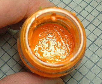 分離した溶剤が蒸発してほとんど残ってなく、塗料はビンを傾けようがドロリとも流れない状態。硬さはちょうどプリンみたいな感じです。
