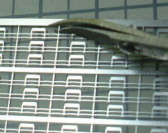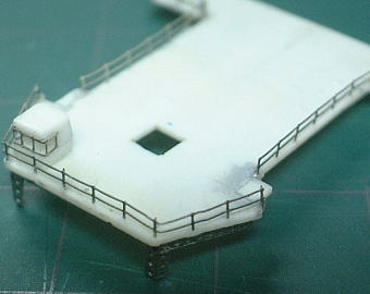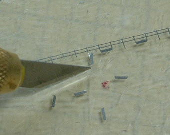 取り付け箇所に0.2mm真鍮線を支柱の位置に合わせて適当な間隔で埋め込んで、真鍮線が支柱で隠れるように手すりを接着します。