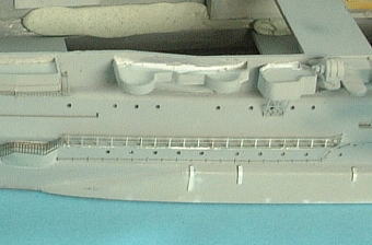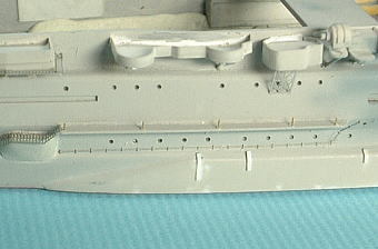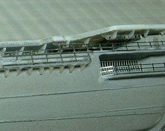 手摺りの一番下のライン(日本海軍用なら三段目、米海軍・現用艦用なら四段目)が接着しろになっており、ここをキット側の側面に取り付けます。