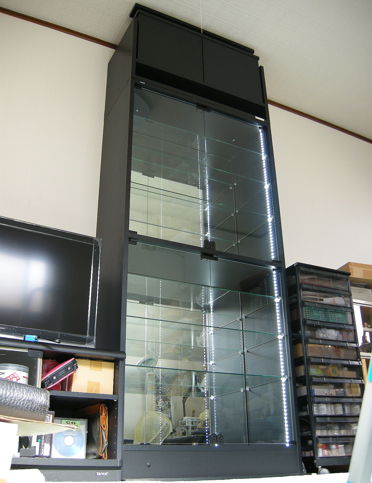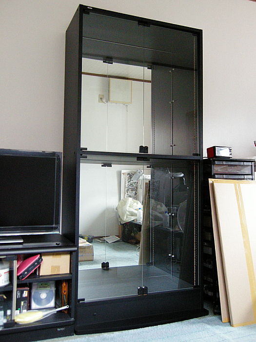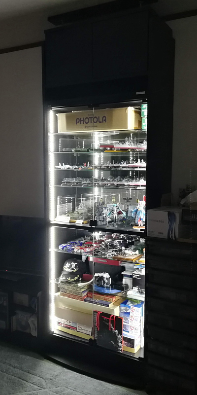 JAJANフィギュアラックには大小数種類あり、それらの中で私が購入したのは最も大きくて奥行きのある「幅83cm 奥行39cm」のワイド・ハイタイプの黒。それにオプションのLED照明、背面ミラー、天井つっぱり上置き棚を加えたフルセットです。