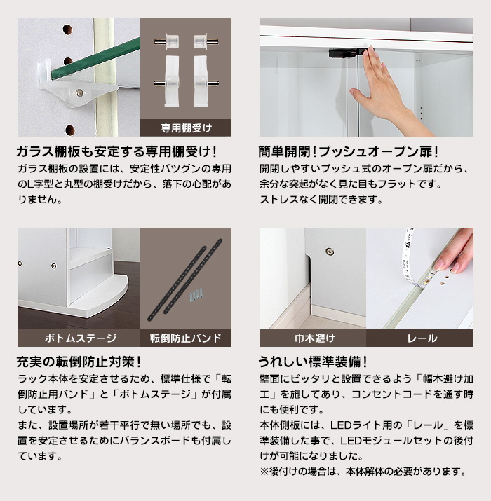 あと扉と棚は強化ガラスなので頑丈ですが、背面ミラーは脆く割れやすいので取り扱いは慎重に。うちのは開梱したら一枚割れていたので、メーカー様に事情を伝えたところ無償交換していただけました。なのでアフターフォローは安心して良いと思います。