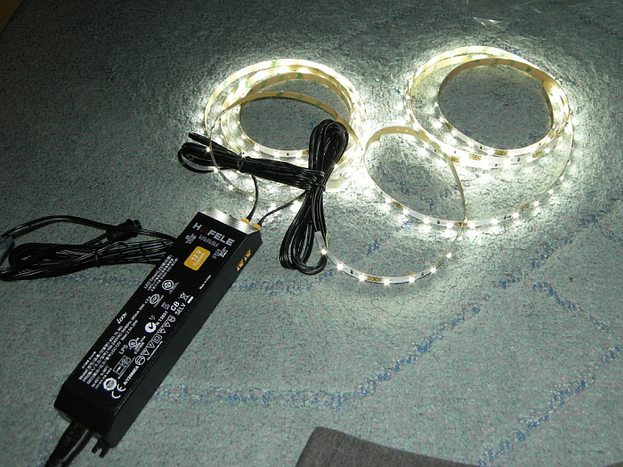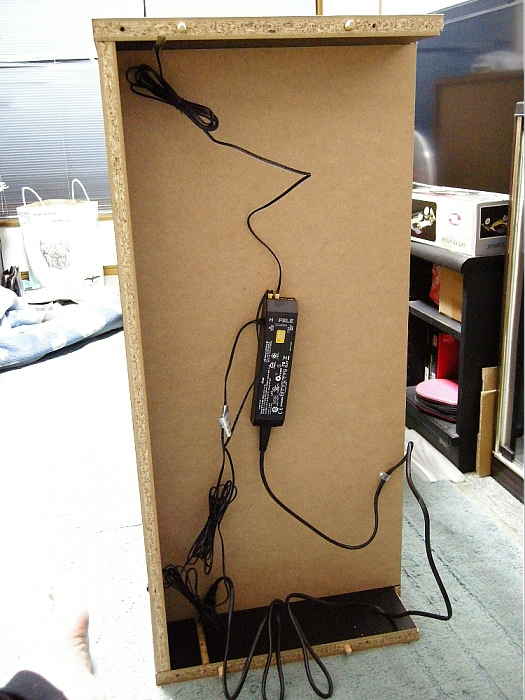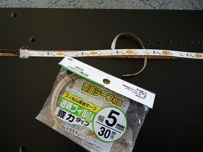 左右側板にLEDテープを貼り付けますが、粘着力がイマイチな気がするので、念のため強力タイプの両面テープで補強しました。組み立て後に剥がれてきりしたら補修に大変な手間がかかりますからね。
