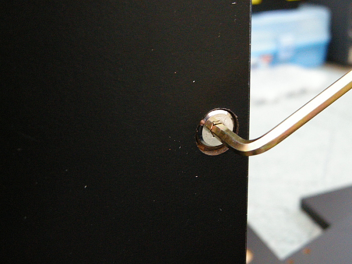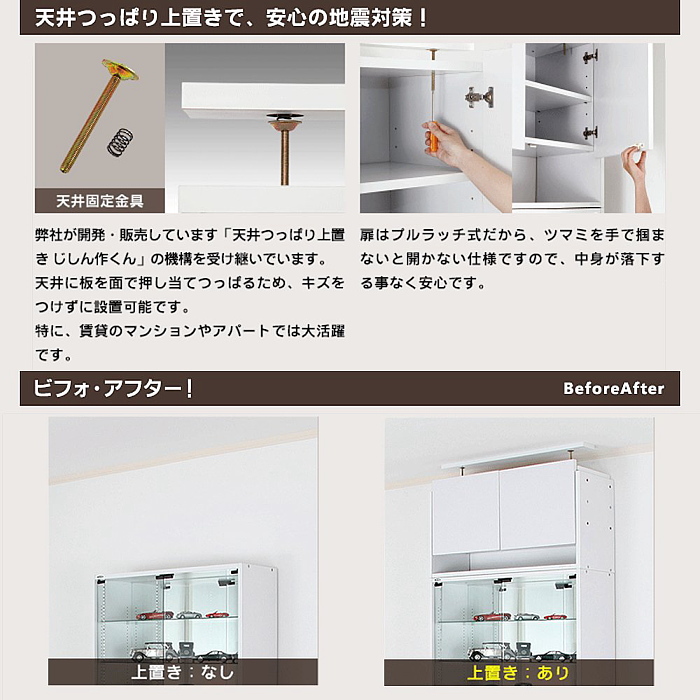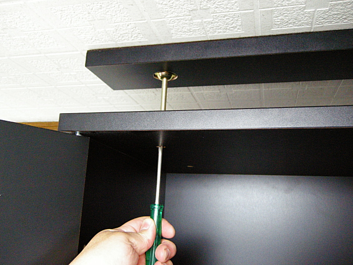 こんな風に上置き棚の天板の内側からドライバーで締め上げて、長尺ボルトで天井固定板を突っ張らせます。