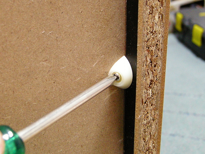 背板は側板の溝に差し込む設計ですが、さらに裏から背板止を+ネジで締め上げる事でガッチリ固定します。