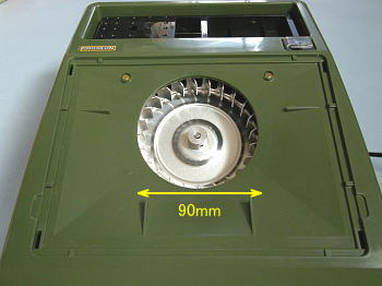 フィルターを外すとややくぼんだ逆四角錘形の中央に、直径90mmのシロッコファンが付いています。 |
