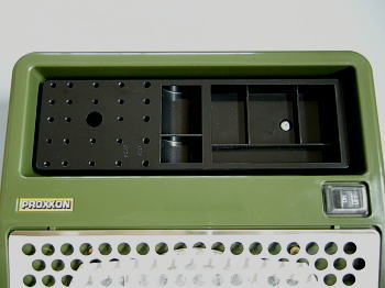 ツールスタンドにはビット類を置けますが、この私はパーツ置き場に使ってます。電源スイッチは粉塵対策で透明ラバーで覆われてます。 |