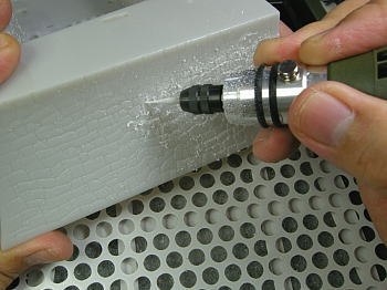 まず最初にルーター(プロクソン ミニルーターMM100)のスイッチを入れ、次にダストキャッチャーのスイッチオン。そして「ジジジジ」という音が入りますが、これはプラを削っている音です。