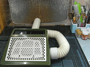排気を室外に逃がそうと思うと、私の作業環境ではホースの長さが、窓まで足りません。その場合はこんな風に塗装ブースを間にかませて室外排気をする事になります。ちなみに吸引力がわずかですが増幅されたように感じます。