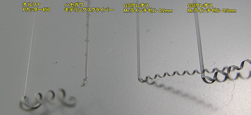 使用感はMr.ラインチゼルが最も切れ味が良く、軽く引くだけでかんなをかけたようにスムーズにシューッと削れます。モデリングスクライバーは手にコリコリと振動が伝わる感じ。Pカッターは深く食い込むので一番引っ掛かり抵抗が強くてジャーッと削る感じ。