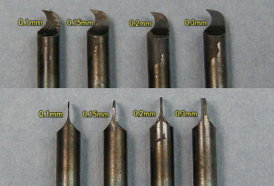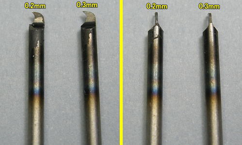 Mr.ラインチゼルを使っていて困ったのは、0.2mmと0.3mmの刃が見分けがつかないくらい似ているので、混ぜてしまうとどっちがどっちなのかわからなくなる事です。