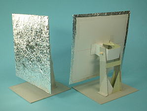 厚紙にアルミホイルを貼ったものですが、台座は角度が調整出来るようにしてあります。