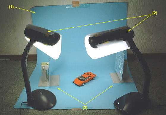 この画像のように自動車模型の場合なら、さらにサブライトを使いハイライトを入れて光沢感・硬質感を出すのも良いですが、今回は基礎編なのでそれは次回にしましょう。