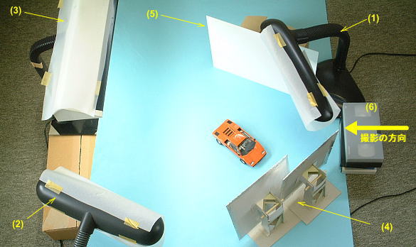 さてどんな方法を使ったのかというと、このようなセッティングで模型に適度な逆光をあててやりました。